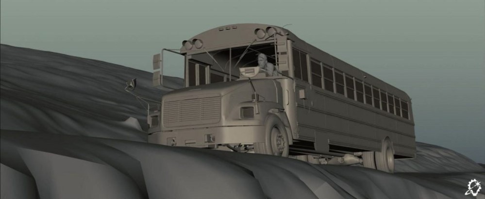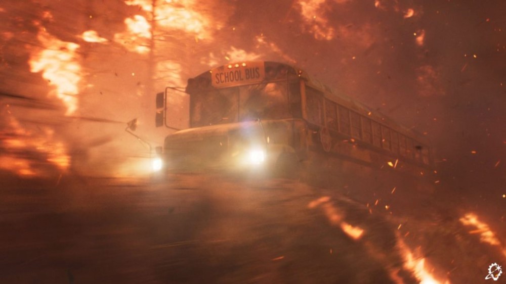 ILM broke up the reference megaclip into separate asset types. “We had shots within the smoke cloud, shots outside of the smoke cloud, big fires, small fires, brush fires, trees burning, houses burning, and cars burning,” Zaretti recalls. “There were fire tornadoes; I didn’t even know that was a thing! We were spoiled with references to the point where the references began to contradict each other because there’d be wind blowing in two different directions in the same piece of footage. Those contradictions actually helped us in certain scenarios. For example, during the escape sequence when the bus is winding down this thin road, there are points where we had flames licking at it from both directions to portray the danger that they were in. So, having a real reference to back up your visual effects often helps.”