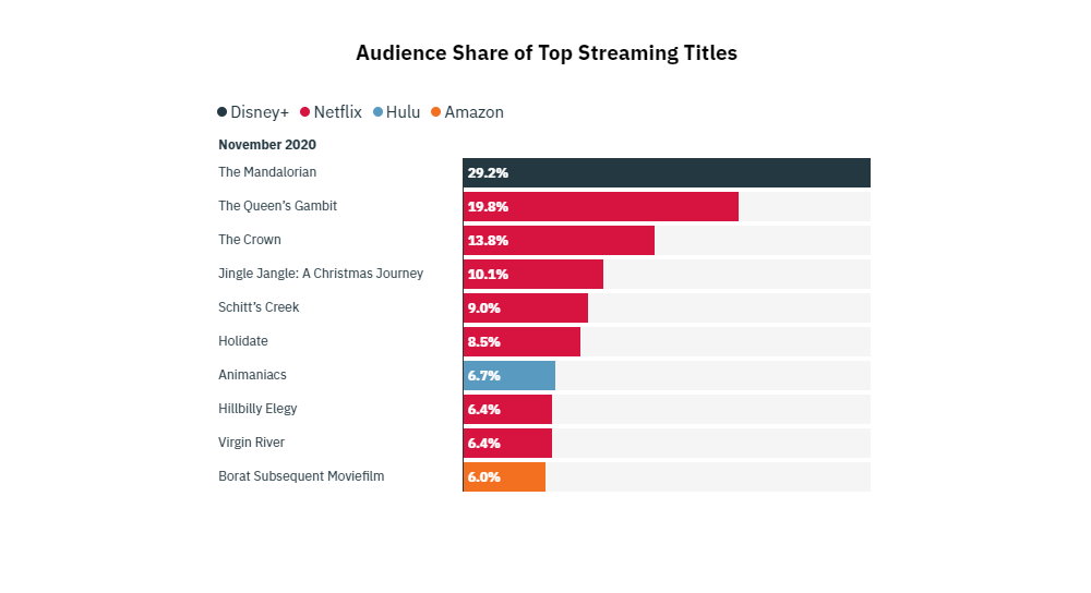 It might be on one of the smaller streamers, but The Mandalorian proved to be a titan of television as it topped the streaming charts and gave Disney Plus its second biggest audience share of the year after Hamilton in July. The Lin-Manuel Miranda musical grabbed 37% back in July, while the November episodes of The Mandalorian nabbed 29.2% delivering a rare 7Park Data cross-platform audience share ranking win for Disney Plus.
