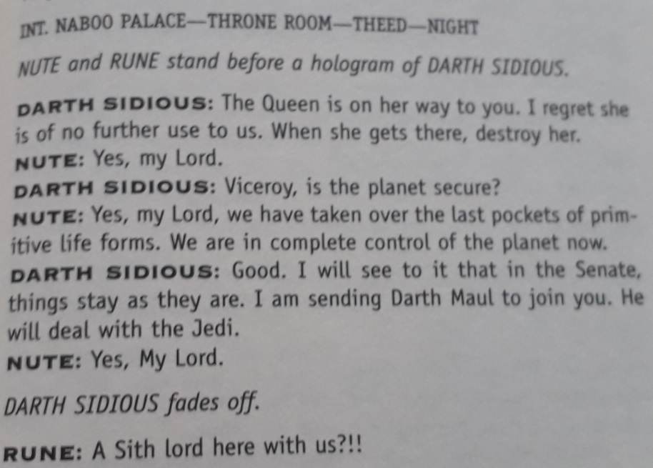 With the Queen, her consorts and the Jedi leaving Coruscant to return to Naboo Darth Sidious contacts Nute Gunray and Rune Haako. In the movie he gets reassured that the planet is under their control and he tells them that Darth Maul will be joining them, but in the original screenplay he tells them a bit more.