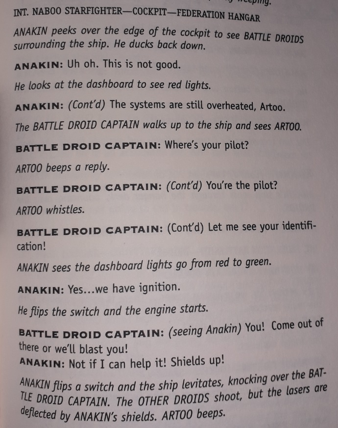 The shooting script also included a small bit of dialogue between Artoo and the battle droids as they approached Anakin’s N-1 starfighter.