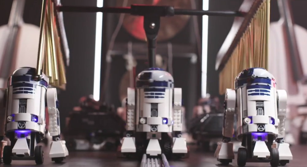 Making up the talented tiny orchestra, is a sea of 46 R2-D2s, 25 Gonk droids and 24 mouse droids. And sitting among the intricate Lego bricks are four cellos, ten violins, eight xylophones, eight keyboards and a spectacular percussion section ranging from electric drums to gongs and chimes.
