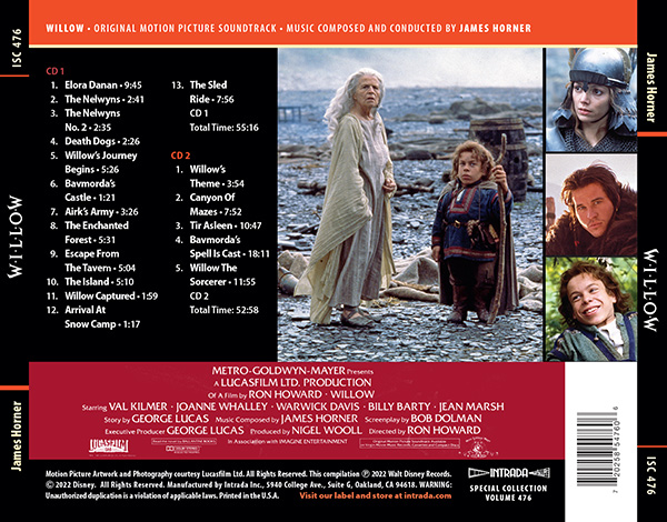 At last! Magnum opus fantasy score by James Horner receives expanded 2-CD set! A Lucasfilm Production, Ron Howard directs, scripted by Bob Dolman, story by George Lucas who also executive produces with Val Kilmer, Warwick Davis sharing majority of the screen time with Joanne Whalley, Billy Barty, Jean Marsh all nearby. Evil sorceress Bavmorda imprisons all pregnant women in her domain to prevent birth of a baby prophesied to bring about the end of her reign. Said baby is born and cast adrift, with Bavmorda, her vicious Nockmaar Hounds and her army in pursuit. Enter Willow Ufgood and the Nelwyns, who find the infant. A perilous adventure ensues that involves the Brownies, a fairy queen, an aging enchantress… and flamboyant rogue and expert swordsman Madmartigan.