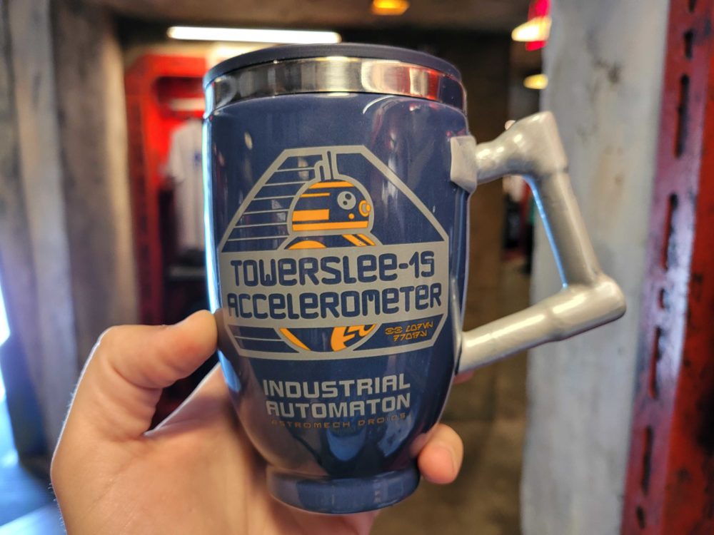 Industrial Automation Astromech Droids brings you the Towerslee-15 Accelerometer, a droid component inside the head of BB-series models. BB-8 glides along the front of this blue mug with an attached “metal” handle.