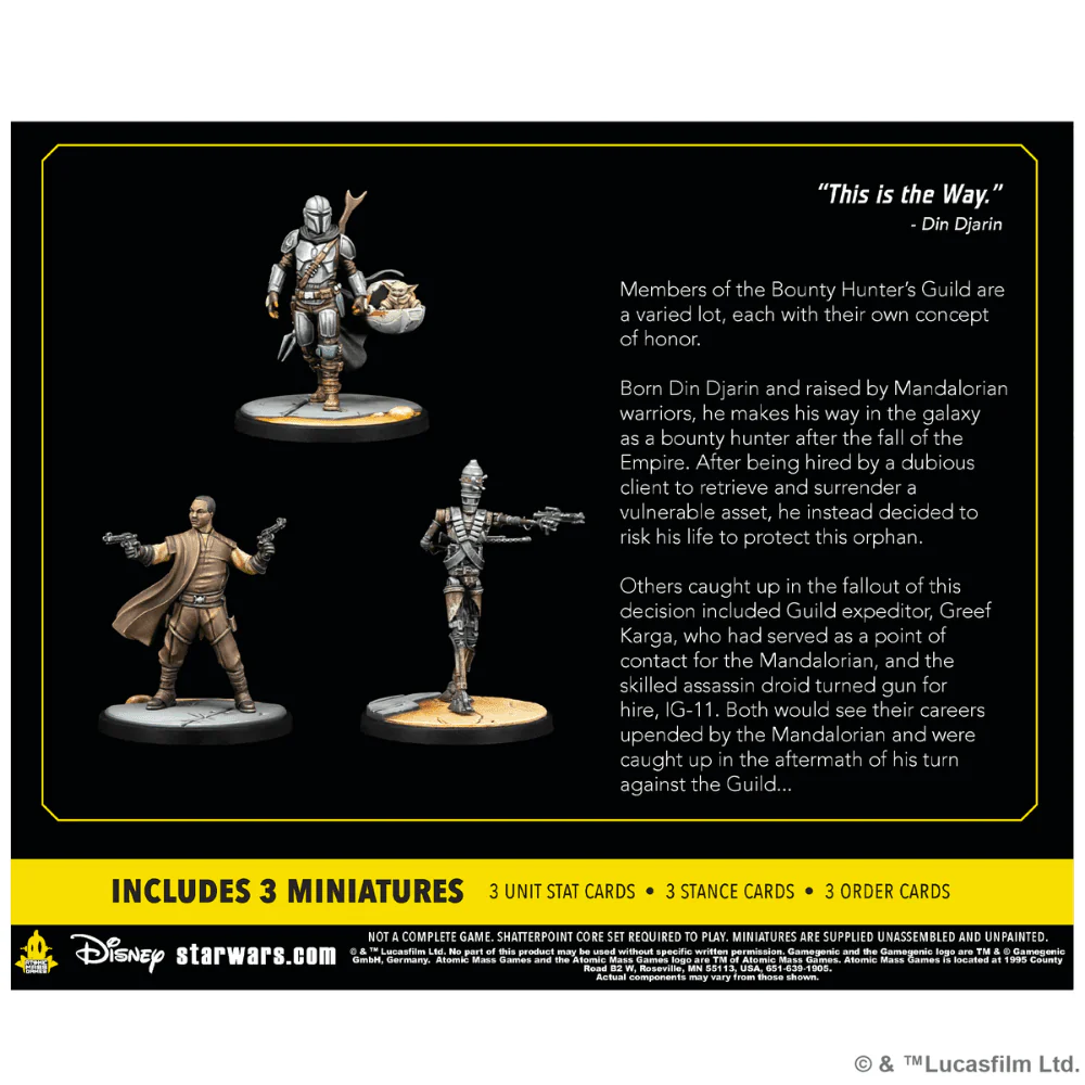 The infamous Bounty Hunters’ Guild comes to Star Wars™: Shatterpoint in this new Squad Pack! The Certified Guild Squad Pack brings The Mandalorian to the game as a Primary Unit alongside Greef Karga as a Secondary Unit and the Assassin droid IG-11 as a Supporting Unit. These characters can either form a complete squad on their own, or can be mixed and matched with other characters in a completely custom squad. No matter who they’re partnered with, this pack includes all the Stat, Stance, and Order cards players need to add them to their games of Shatterpoint.