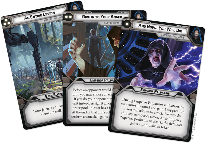 In this expansion, you’ll find one easily assembled, unpainted Emperor Palpatine miniature, the Emperor’s three signature command cards, three upgrade cards, and all the other cards and tokens you need to add the Emperor to your army as a commander. Read on to see how you can use the Emperor to hatch your own schemes and seize victory!