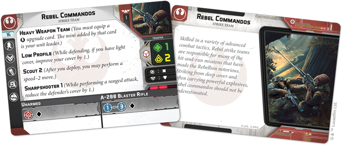 This is especially true of the Rebel Alliance, who lack the numbers to face down legions of Imperial troops in open battle. For them, a team of operatives working on the fringes of a battle can assist more traditional troops by making use of unorthodox tactics to disrupt Imperial operations.