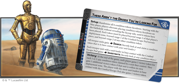 In addition to letting you add these iconic droids to your Rebel Alliance or Galactic Republic armies, this expansion places R2-D2, C-3PO, and their crashed escape pod at the center of two unique scenarios that challenge you to secure the droids before your opponent. To do so, six new battle cards outline your objectives, deployment zones, and conditions for these missions.
