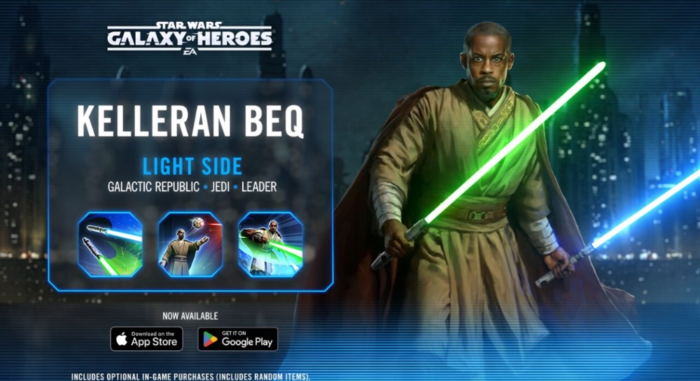 Kelleran Beq, the fan-favorite Jedi Master, is coming to Star Wars: Galaxy of Heroes. Available in the hit mobile strategy game starting Thursday, December 7, Beq will wield both green-and blue-bladed lightsabers, in addition to Force abilities.