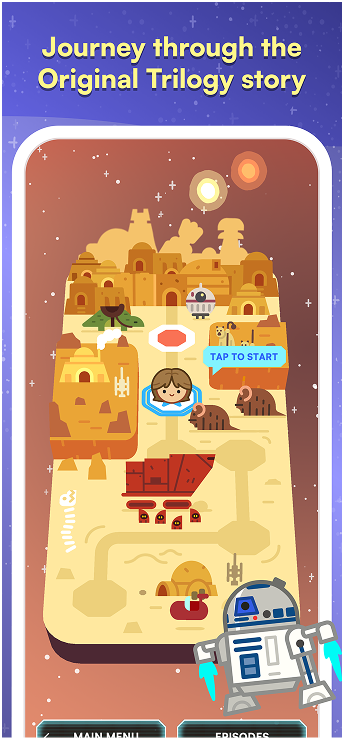 Embark on an epic adventure with over 50 levels spanning the many locales across the Original Trilogy. Each level features Star Wars-inspired landmarks including Tatooine, the Mos Eisley Cantina, the Death Star and more.
