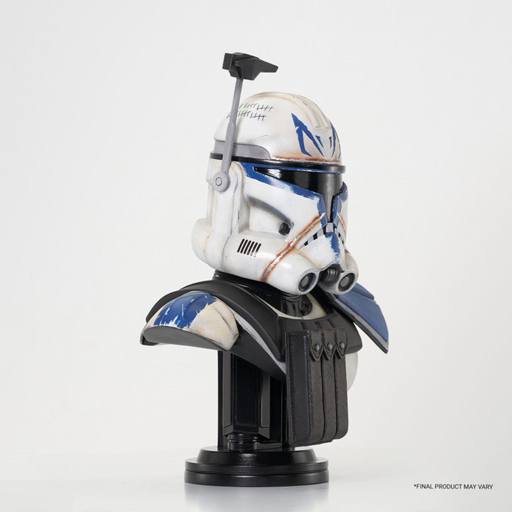 Remember Rex! The Clone Army captain was a legend in the Clone Wars, and now he’s a Legend in 3-D! Measuring approximately 10 inches tall, this ½ scale portrait of Rex in his later, modified armor, features his pauldron, welded details, and tally marks on his helmet, all atop a pedestal base. It is limited to only 1000 pieces and comes packaged with a numbered base and a numbered certificate of authenticity in a numbered full-color box.