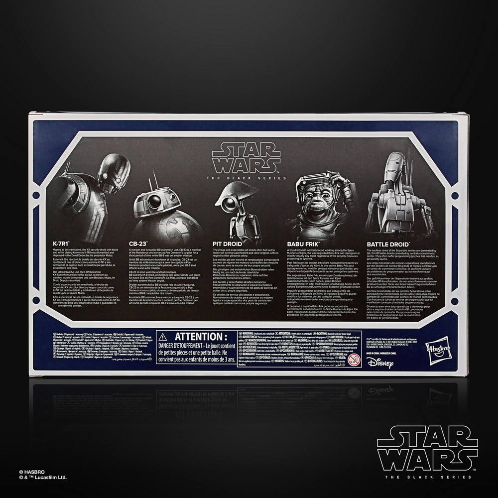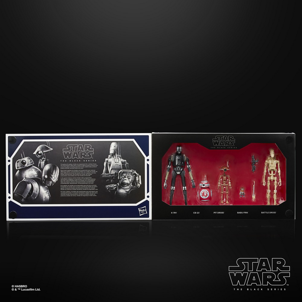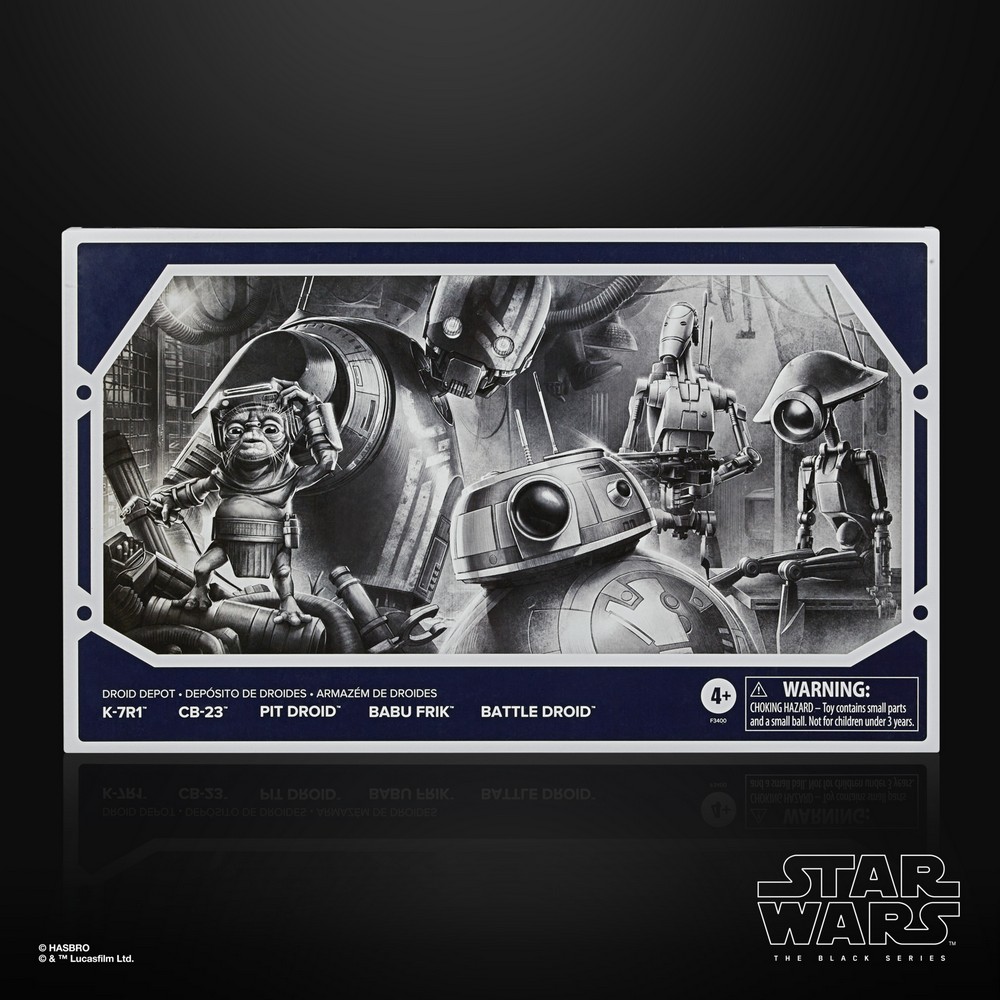 Fans and collectors can imagine scenes from the STAR WARS Galaxy with these premium STAR WARS: THE BLACK SERIES 6-INCH DROID DEPOT TOY ACTION Figures including K-7R1, CB-23, PIT DROID, BABU FRIK, and BATTLE DROID. STAR WARS fans can display these 6-inch scale fully articulated figures featuring poseable head, arms, and legs, as well as premium deco, in their action figure and vehicle collection. Includes 5 figures and 1 accessory. This item is a Disney Parks exclusive.