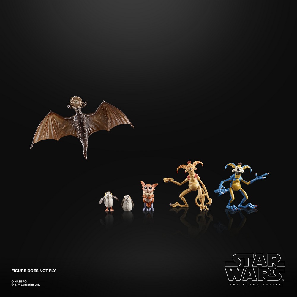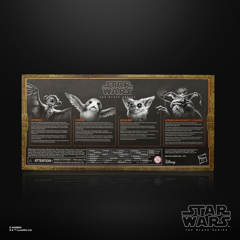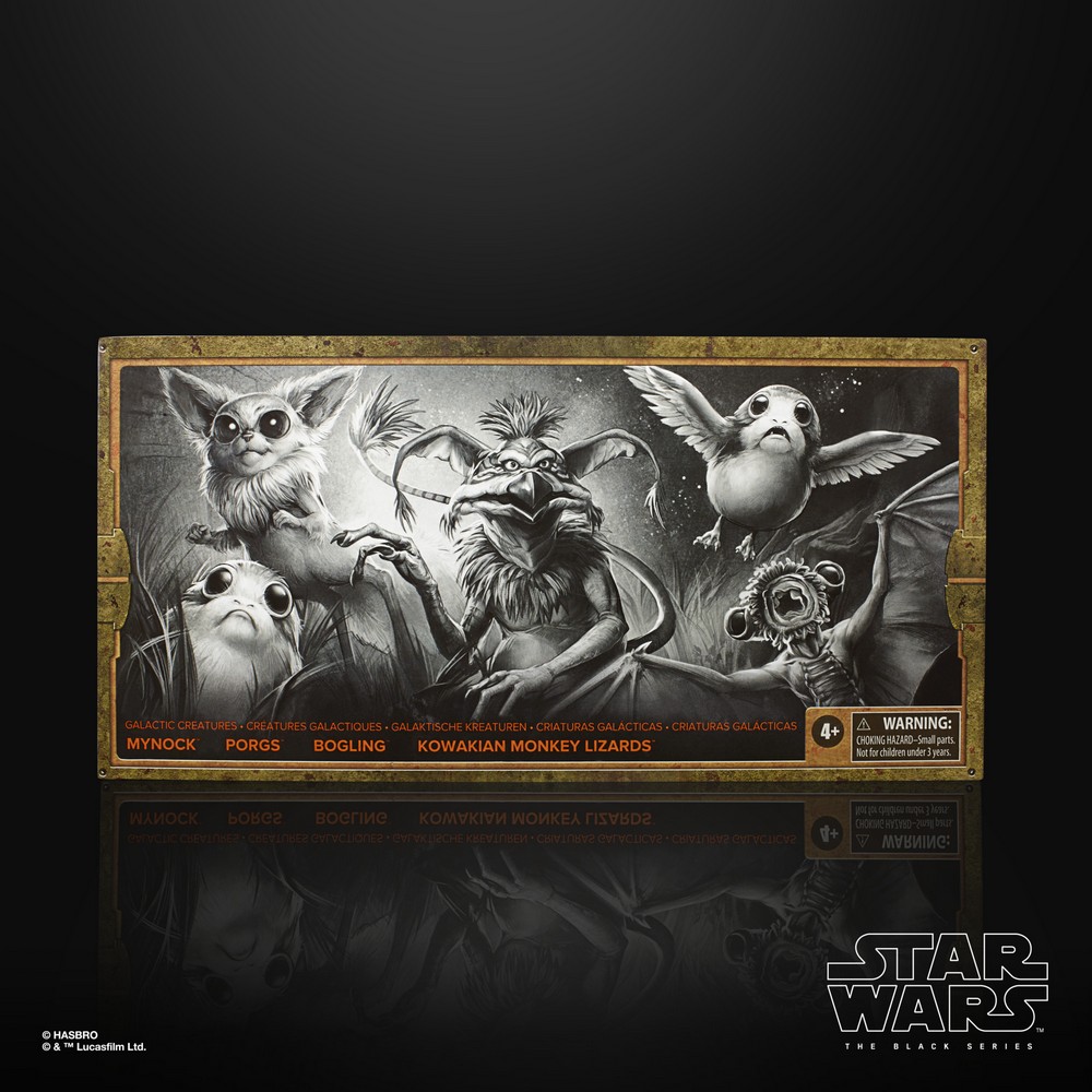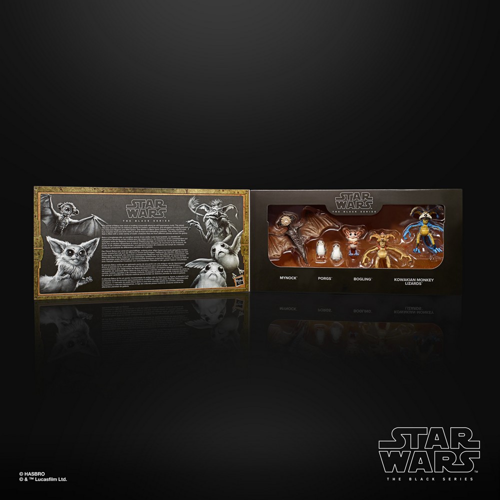Fans and collectors can imagine scenes from the STAR WARS Galaxy with these premium STAR WARS: THE BLACK SERIES 6-INCH GALACTIC CREATURES TOY ACTION Figures inspired by the characters MYNOCK, PORGS, BOGLINGS, and KOWAKIAN MONKEY LIZARDS. STAR WARS fans can display these 6-inch scale fully articulated figures featuring poseable head, arms, and legs, as well as premium deco, in their action figure and vehicle collection. Includes 6 figures. This item is a Disney Parks exclusive.