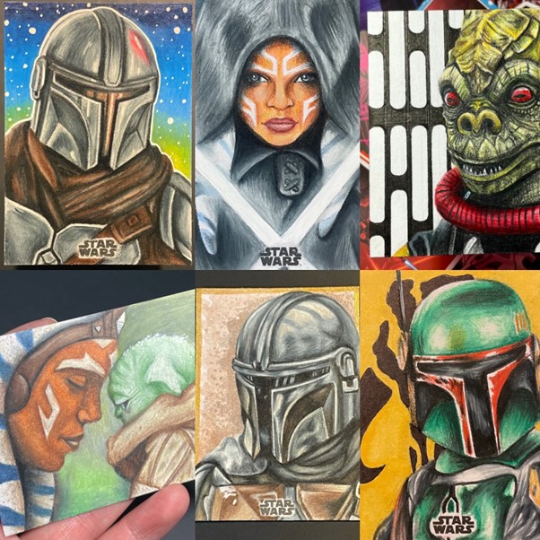 JM: I love drawing the ladies of Star Wars;Â Ahsoka, Leia, and Padme are ones I draw a lot. Droids are my favorite subject to make though, I am constantly making droid cards. Lastly, I really enjoy Mandalorian helmet drawing, they are pretty simple but the metallics are fun to mimic.