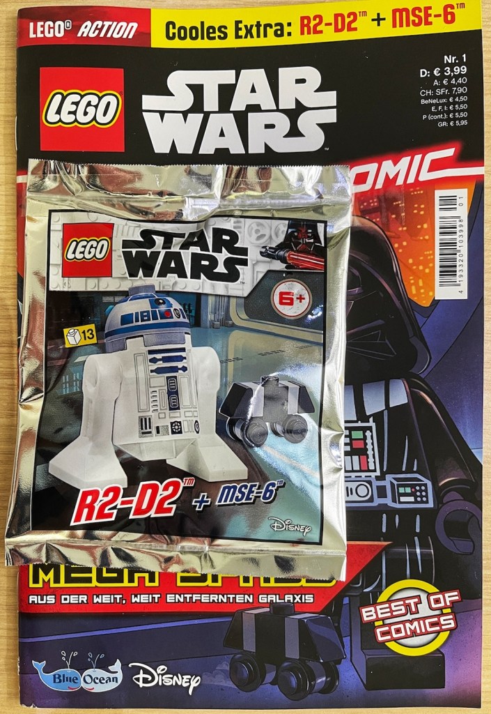 Similar to the bi-monthly LEGO Star Wars Megazine published in France by Panini Kids during 2017/18 or the bi-monthly MEGA Magazine (Immediate Media, UK) that periodically features LEGO Star Wars content, this bumper comic comes with a cover-mounted R2-D2 minifigure and brick-built MSE Droid foil bag (the same that was available in the March 2020 edition of LEGO Star Wars Magazine in the United Kingdom) and contains bundles of comics and a pullout double-sided poster.