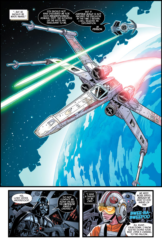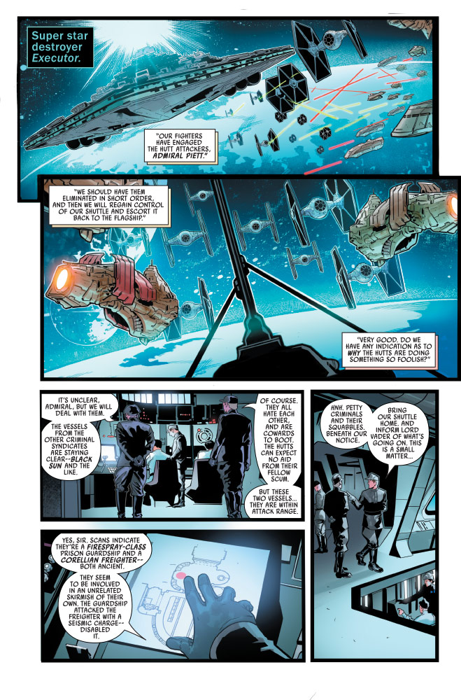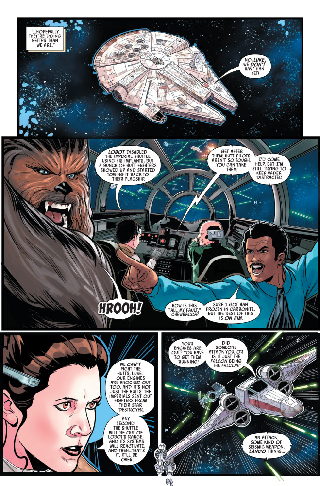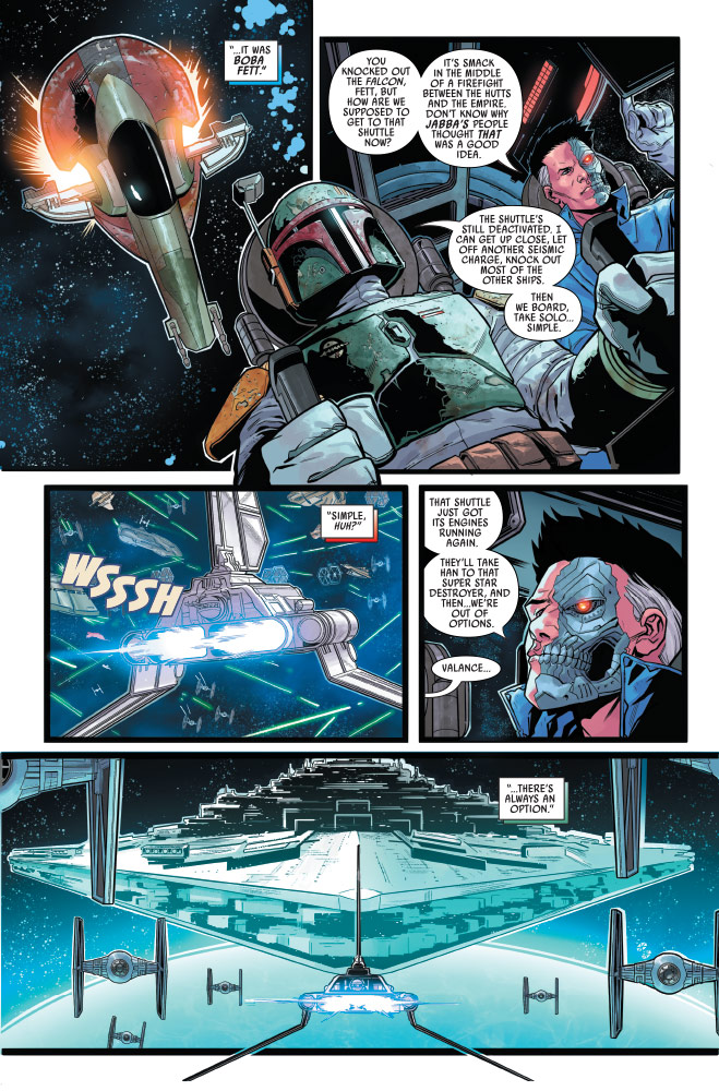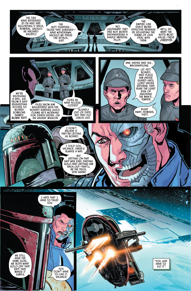 In StarWars.com’s exclusive preview of the next issue of Marvel’s Star Wars: War of the Bounty Hunters, part of the comic crossover event following the hunt for Han Solo after Star Wars: The Empire Strikes Back, Fett uses an old code to get back behind Imperial lines with Beilert Valance reluctantly by his side.