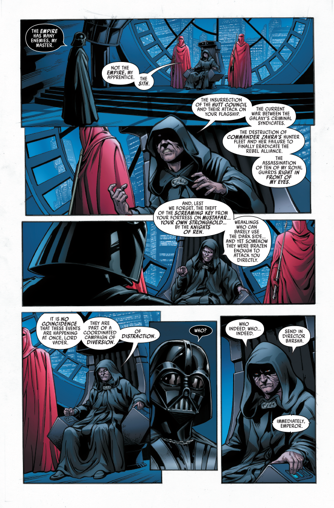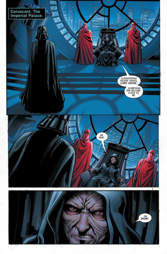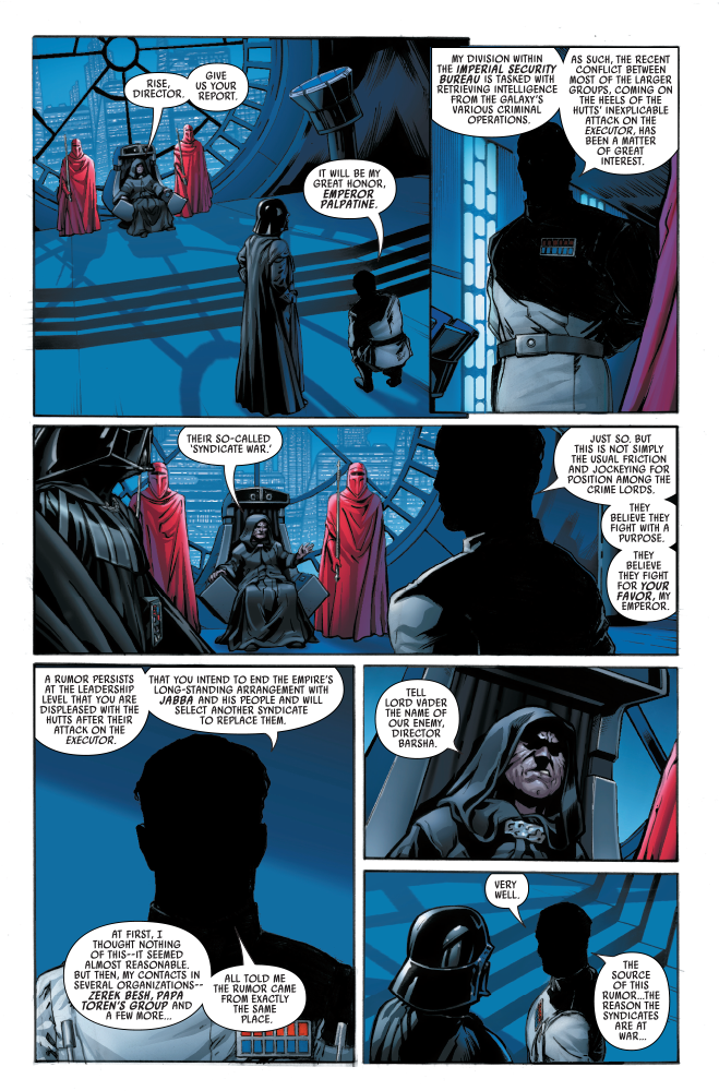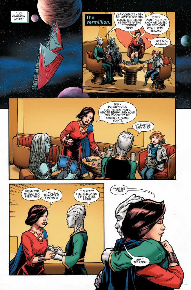 Qi’ra’s plot to ultimately bring down the Empire is in full bloom, but she hasn’t tricked everyone. In StarWars.com’s first look at Marvel’s Star Wars: Crimson Reign #5, the final installment of the epic miniseries, the Emperor lets it be understood that he knows more about Crimson Dawn’s machinations than once thought.