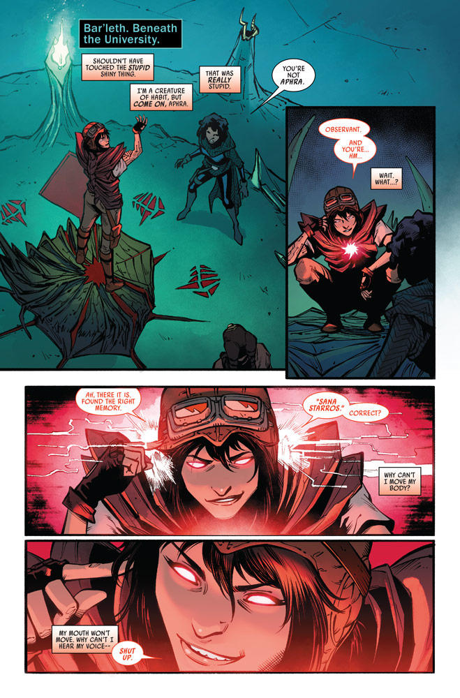 In the last issue of Marvel’s Star Wars: Doctor Aphra, Aphra and Sana Starros finally found the Spark Eternal. But upon touching the ancient artifact, Aphra was killed, resurrected, and taken over by the entity within. In StarWars.com’s first look at Doctor Aphra #21, the rogue archaeologist awakens, only to find that she’s powerless in her own body.