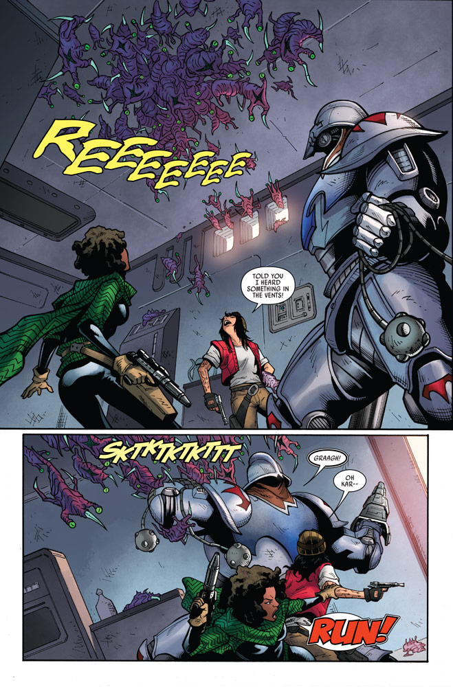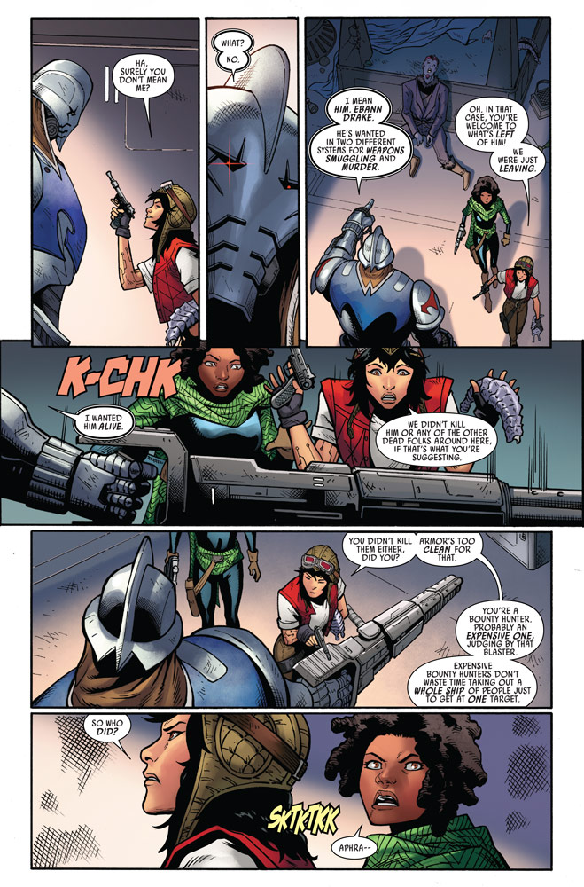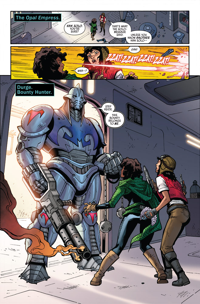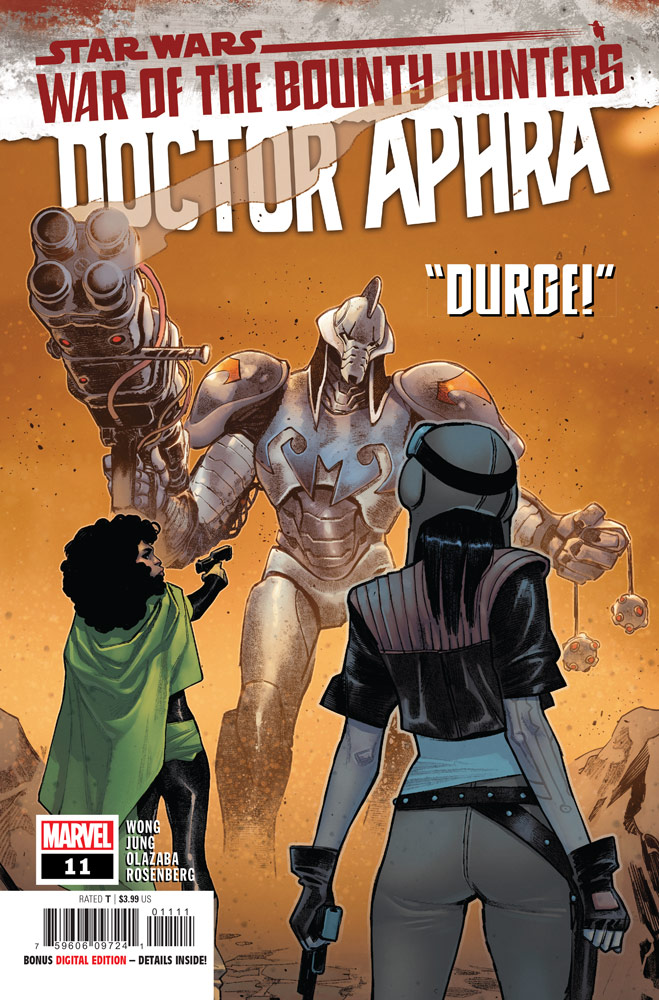 The popular bounty hunter, originally created for Genndy Tartakovsky’s classic Clone Wars 2D Micro Series, is making the jump to modern Star Wars storytelling. In StarWars.com’s exclusive first look at Marvel’s Star Wars: Doctor Aphra #11, part of the War of the Bounty Hunters crossover, Durge makes his first full appearance while seeking a bounty; unfortunately, it leads him to cross paths with Aphra and Sana Starros…