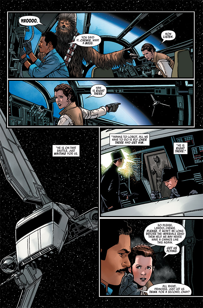 In Marvel’s Star Wars #17, part of the War of the Bounty Hunters crossover centered around Boba Fett’s journey to bring Han Solo to Jabba the Hutt following the events of Star Wars: The Empire Strikes Back, Vader chases young Skywalker down while Leia, Lando, and Chewie take their shot at bringing Solo back home.