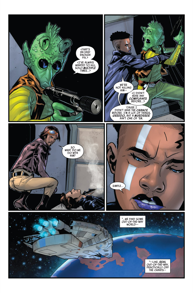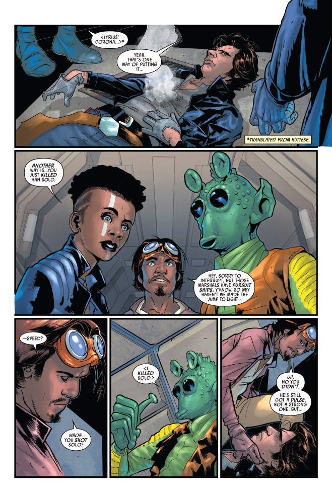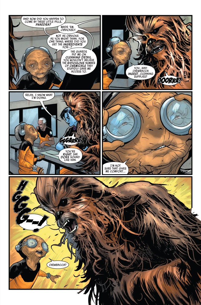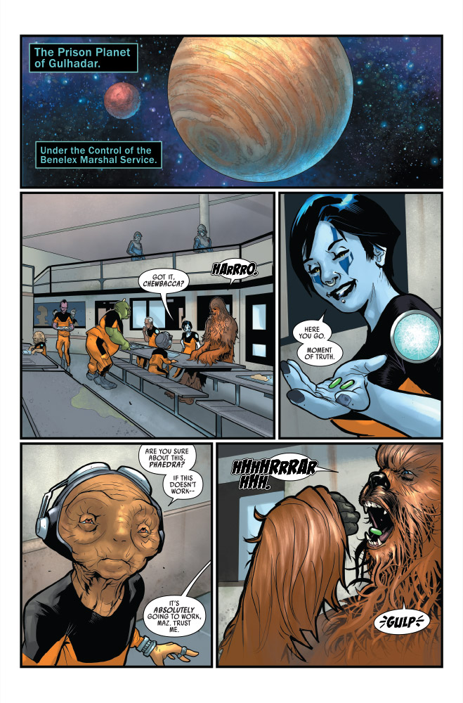 In Star Wars: Han Solo & Chewbacca #7, the titular duo have their own problems. Han has been shot by Greedo, and it doesn’t look good. Chewie, held in an actual prison and sentenced to death, hatches a questionable scheme with allies Maz Kanata and Phaedra…