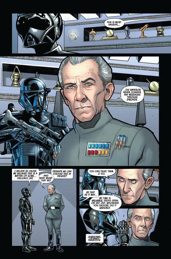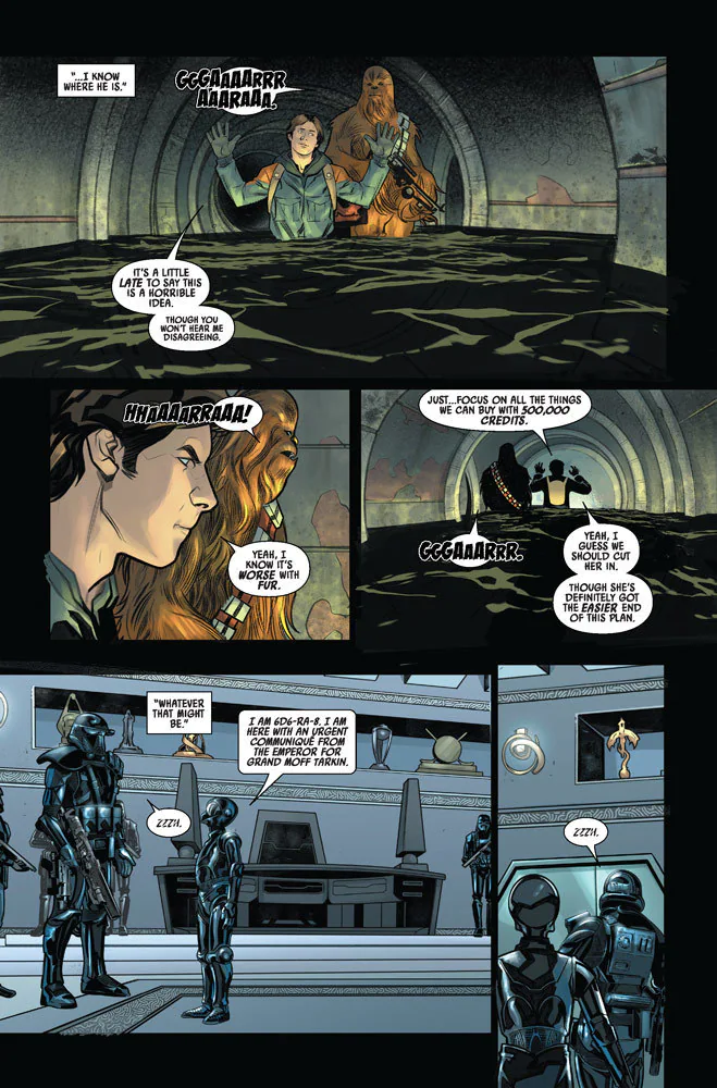 As Marvel’s Star Wars: Han Solo & Chewbacca series continues with issue #8, the titular duo looks to pull off the impossible: stealing from the office of Grand Moff Tarkin. In StarWars.com’s exclusive first look at the issue, Han and Chewie take an alternate (and gross) route to gain entrance. Hopefully it turns out to be worth it.