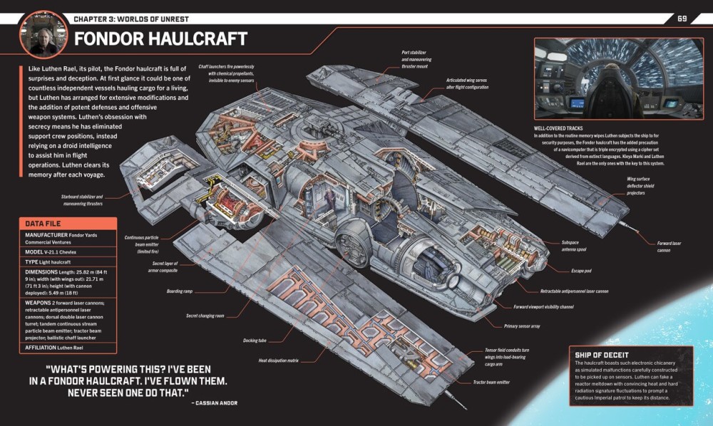 This book features a wonderful, iconic DK cross-section illustration by John R. Mullaney examining the ins and outs of Luthen Rael’s Fondor haulcraft. From the initial sketches, I added notes and shared visuals with ILM VFX supervisor Mohen Leo and Production Designer Luke Hull. I compared it to set photography and set blueprints, lining up the doors with the hull shape to see what should go where. The biggest cheat required an unseen 90-degree hook in the curved corridor that changed the entry ramp placement from an intended portside entrance to the finished starboard entrance. And I was able to confirm from Luke that Luthen’s “changing area” is indeed a secret room hidden behind a false wall. The ship’s intended role as a hauler is supported by artwork showing the wings lugging suspended cargo underneath, which the callouts on the cross-section describe. – PH