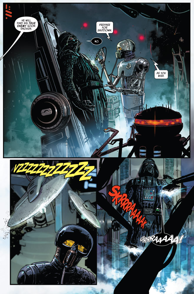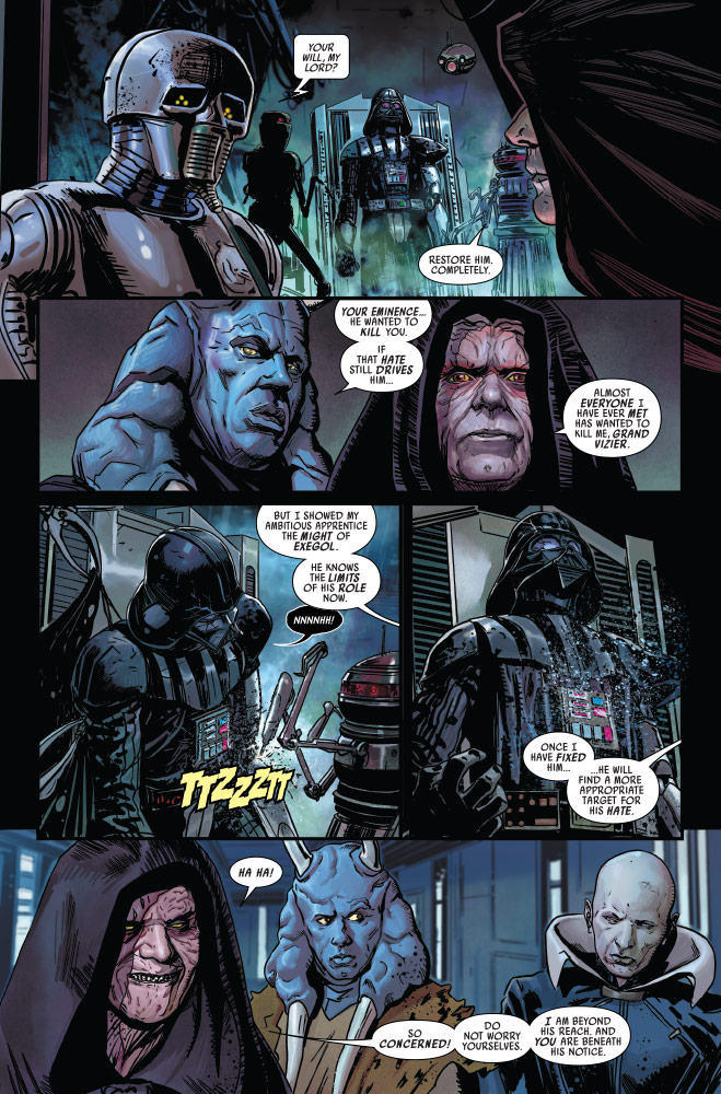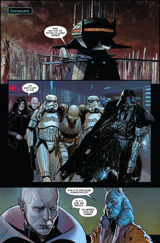 In StarWars.com’s exclusive preview of Star Wars: Darth Vader #12 — part of Marvel’s epic crossover War of the Bounty Hunters, which explores Boba Fett’s journey to Jabba the Hutt following the events of Star Wars: The Empire Strikes Back — the formidable Sith Lord limps back to Coruscant to be restored to his full mechanical majesty once more by the grace of his master, Darth Sidious.