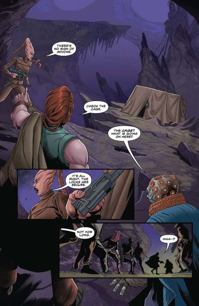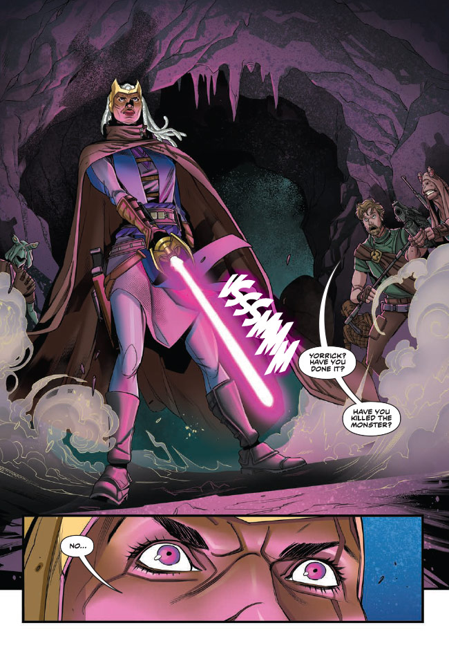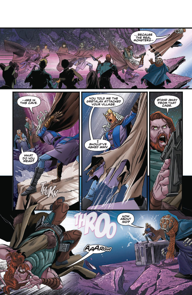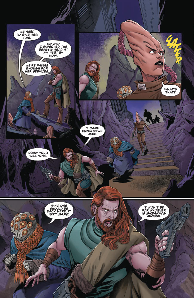 In StarWars.com’s exclusive preview of IDW Publishing’s Star Wars: The High Republic Adventures: The Monster of Temple Peak #4, the group that hired monster hunter Ty Yorrick to slay the fearsome Gretalax anxiously awaits her return. But when Yorrick — who had sensed that something was amiss all along — finally appears, her employers are in for a surprise…