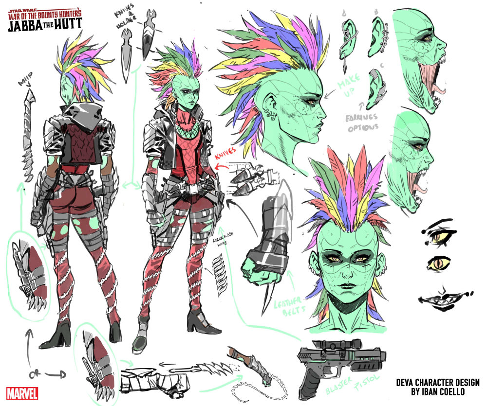 New York, NY— June 25, 2021 — Announced yesterday on StarWars.com, a new bounty hunter character will be making their first appearance on July 21st in STAR WARS: WAR OF THE BOUNTY HUNTERS – JABBA THE HUTT #1. Created by writer Justina Ireland and artist Iban Coello, Deva Lompop will be recruited by Jabba the Hutt to succeed where Boba Fett has failed and bring him Han Solo! Equipped with an array of unique weaponry and sporting a killer design, Deva is set to have a major impact on the action-packed crossover and will appear in all four upcoming War of the Bounty Hunters one-shots.