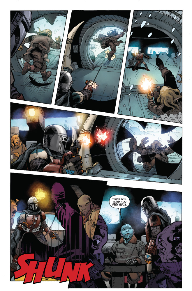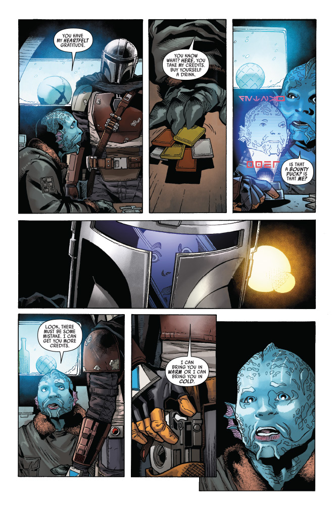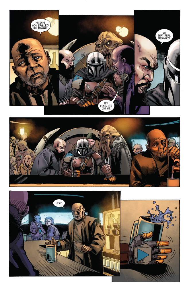 In StarWars.com’s exclusive first look at Marvel’s Star Wars: The Mandalorian #1, the mysterious beskar-clad warrior arrives to claim his bounty on the Mythrol.