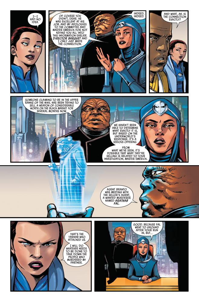 In Marvel’s Star Wars: The High Republic: Trail of Shadows #2, Jedi Master Emerick and Private Investigator Sian Holt will cross paths as the plot thickens, and Chancellor Soh reveals new intel that links the death of Holt’s old partner, an undercover agent for the Republic, to the disastrous consequences of the Republic Fair.
