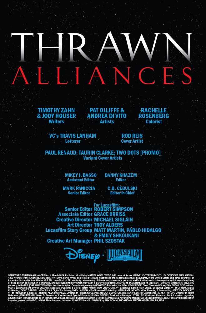 Thrawn: Alliances #1, written by Timothy Zahn and Jody Houser, and illustrated by Pat Olliffe and Andrea Di Vito with a cover by Rod Reis, arrives January 24.