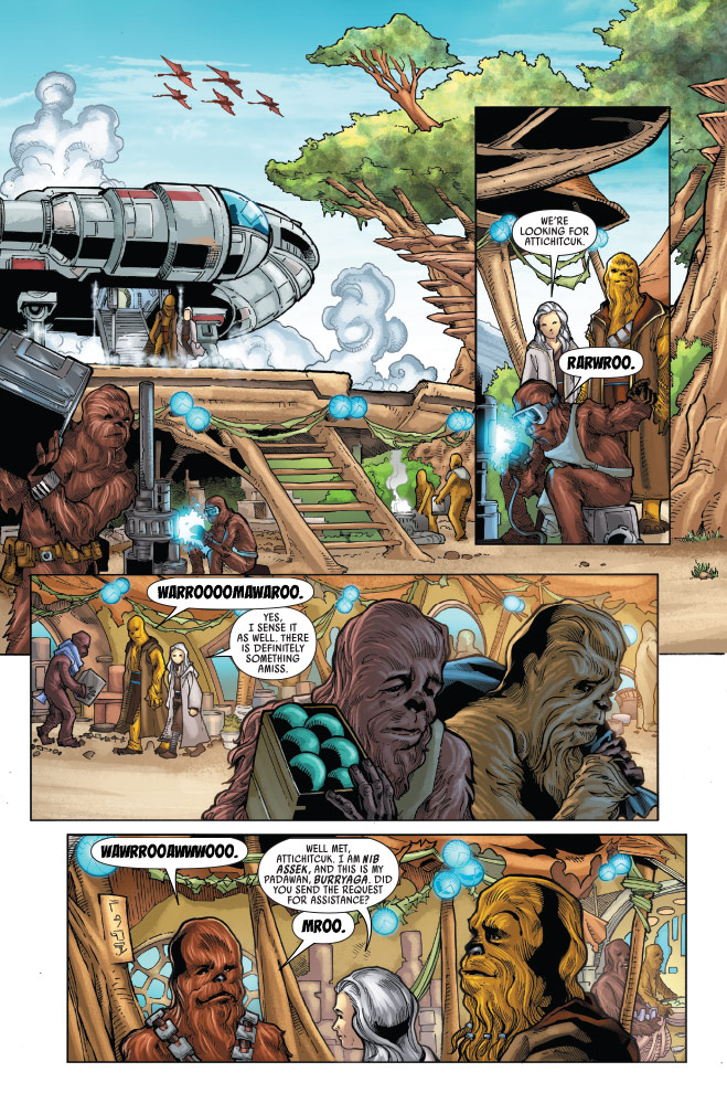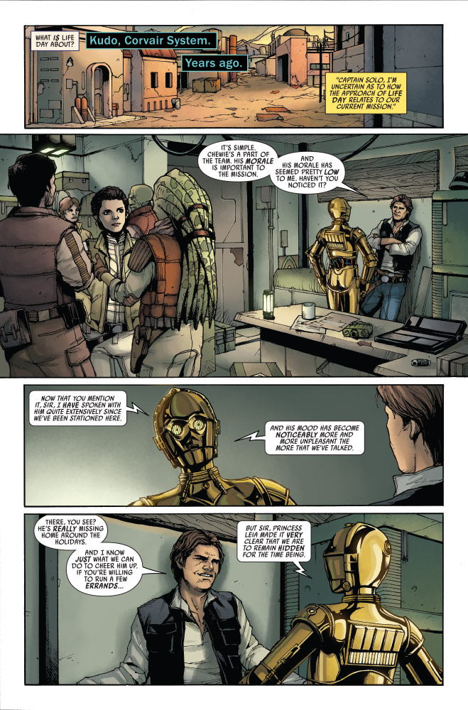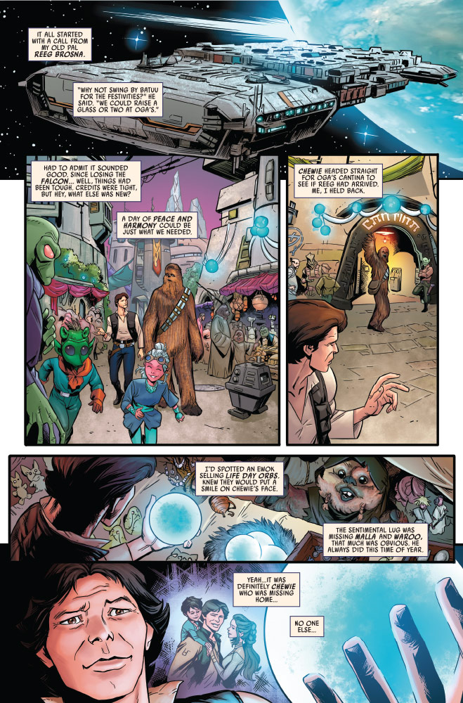 In Marvel’s Star Wars: Life Day #1, four individual stories celebrate the reason for the season centered around the Wookiee holiday, with adventures to Batuu, Kashyyyk, and beyond. In the first glimpse inside, we find Han missing his wife and son, a flashback from the age of the Empire, and a tale from The High Republic featuring another famous Wookiee, Burryaga, and his master Nib Assek.