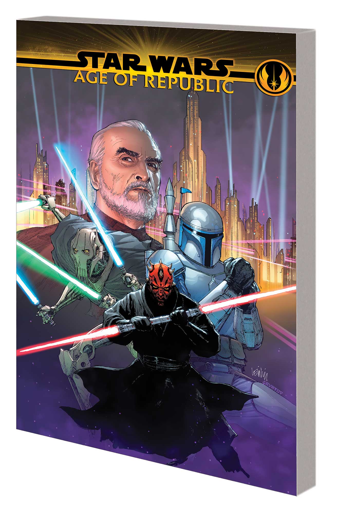 | This is the Age of Star Wars — an epic series of adventures that unite your favorite characters from all three trilogies! And we’re bringing on the bad guys — shining a light on the Old Republic’s darkest figures, starting with Darth Maul! A living weapon of rage, Maul lurks in Coruscant’s shadows waiting to strike against the Jedi Order! But the bloodthirsty Sith Lord questions his methodically plotting master’s wishes. Could Maul have walked another path, or was he always fated to follow this dark road? Meanwhile, Count Dooku begins laying the groundwork for the conniving Darth Sidious! The fearsome separatist General Grievous strikes! Jango Fett’s reputation as the most feared bounty hunter in the galaxy precedes him as he joins a crew for what seems like a simple job. And delve deep into the dark side with Asajj Ventress! Collecting STAR WARS: AGE OF REPUBLIC — COUNT DOOKU, DARTH MAUL, GENERAL GRIEVOUS, JANGO FETT and material from STAR WARS: AGE OF REPUBLIC SPECIAL.