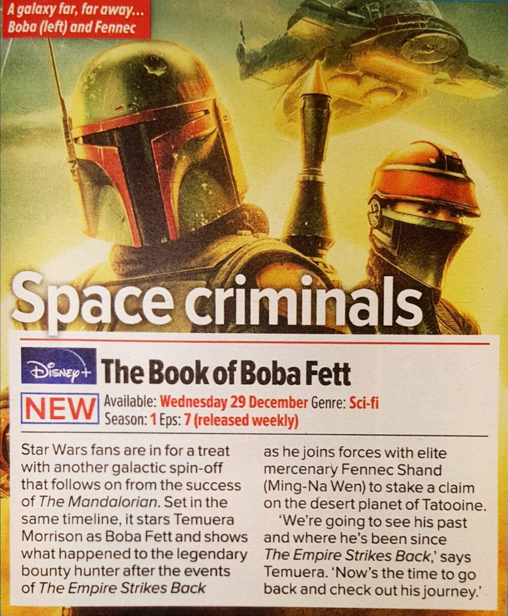 The 18th – 31st December issue of What’s On TV magazine (issue 50) is currently on sale in the UK and includes a short feature on The Book of Boba Fett, which begins Wednesday 29th December on Disney Plus.
