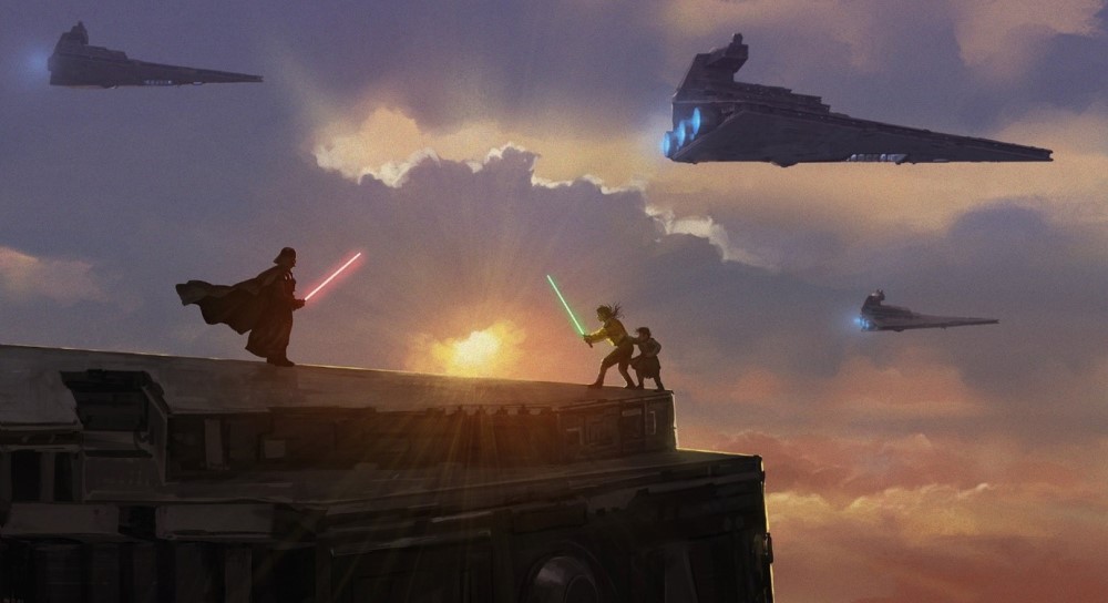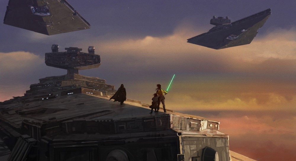 ‘I wanted to try a highly contrasted scene, with small characters on an Imperial Star Destroyer (ISD), at the very point of the ship, and bringing dramatization with a dead end for Jedi trying to escape Lord Vader.