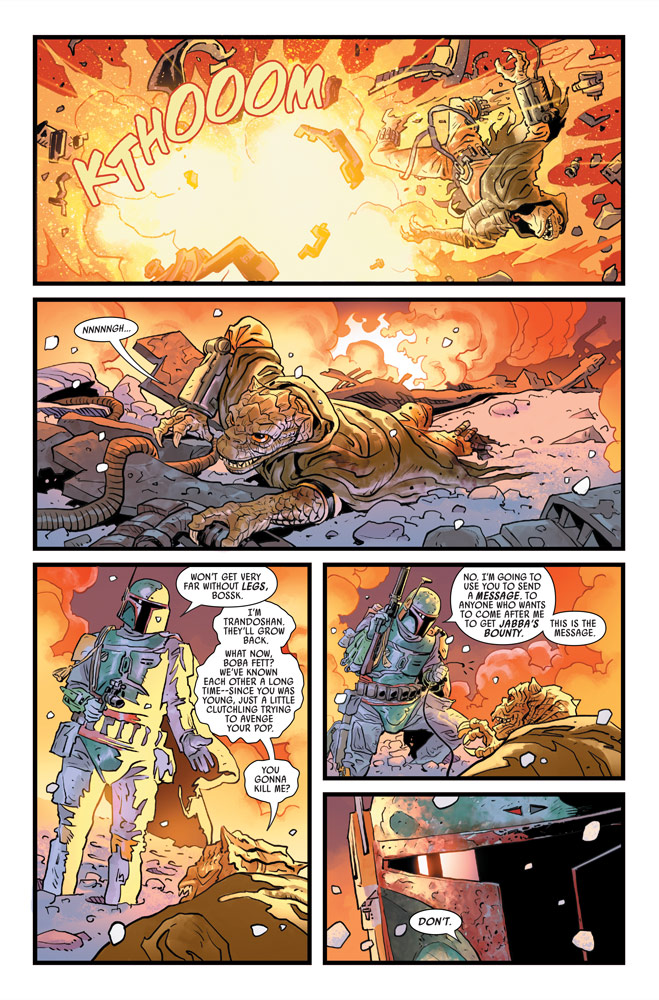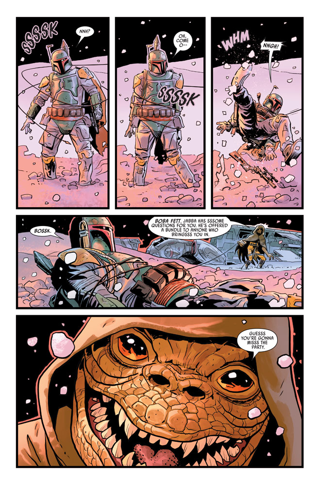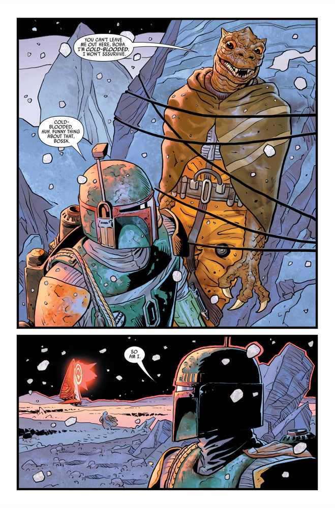 In the second issue of the new Star Wars: War of the Bounty Hunters comic, we find the two mercenaries at odds on Jekara en route to an elite underworld auction and locked in a fight that proves that they’re both cold-blooded killers. Marvel’s epic crossover War of the Bounty Hunters continues next week, centered around Boba Fett’s journey — and battles — to bring Han Solo to Jabba the Hutt following the events of Star Wars: The Empire Strikes Back.