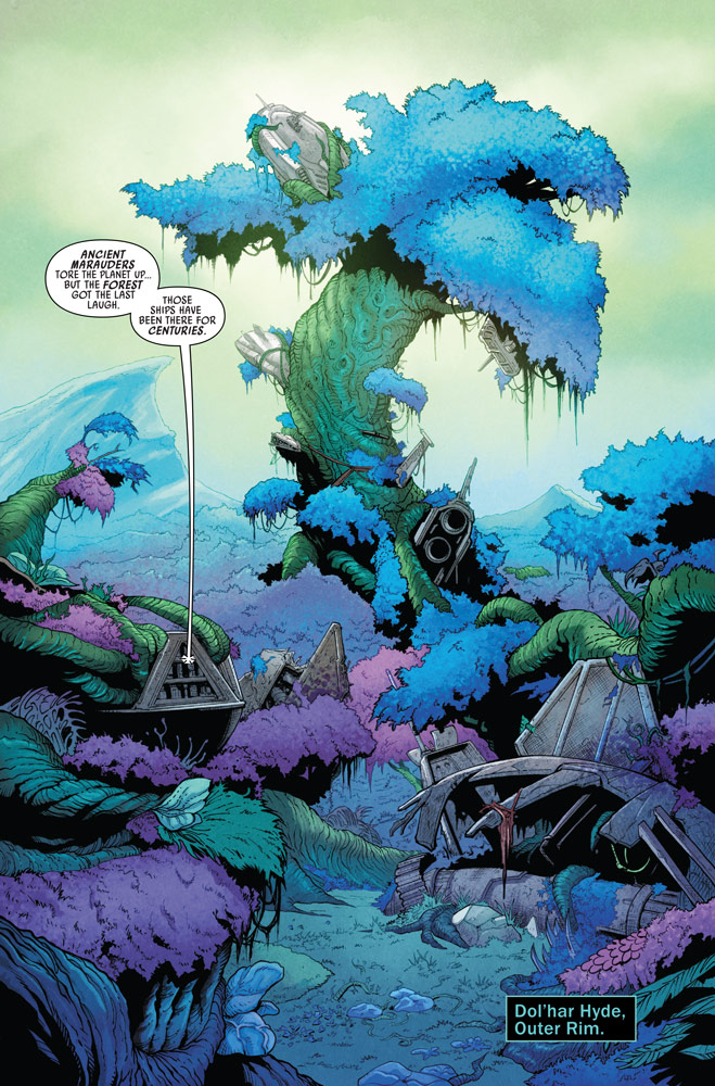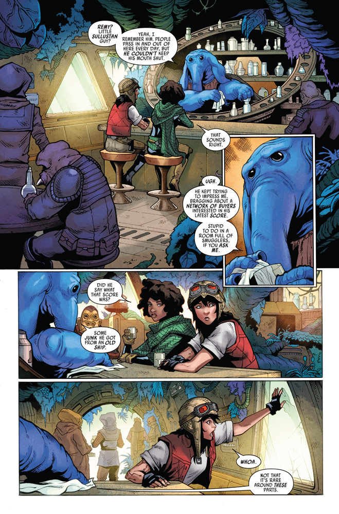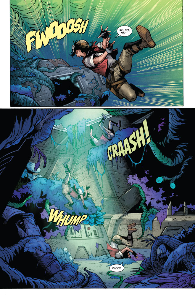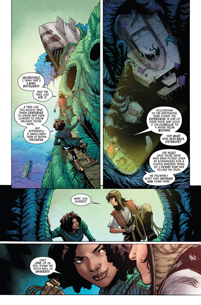 But Doctor Aphra and Sana Starros are intent on unearthing the secrets enshrined in the mechanical remnants left behind by the fearless marauders. What awaits them inside the devastation of the ancient battlefield? Judging by StarWars.com’s exclusive first look, untold treasures and one very long fall.