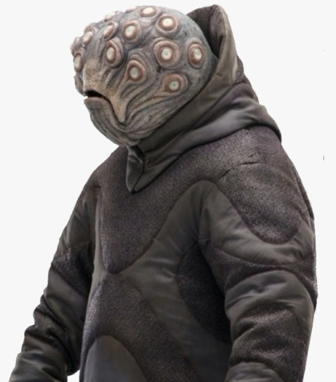 Not new, but not often seen is an alien with many eyes, seen here as the vendor where Obi-Wan buys a little green cape (and some unneeded gloves). This is a Boosodian from Episode IX: The Rise of Skywalker.