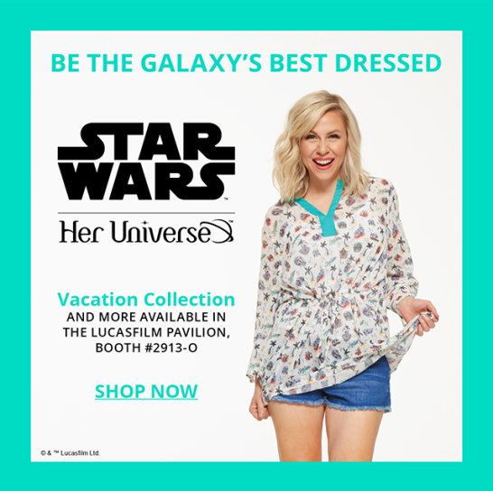 The latest Her Universe and Our Universe collections will be available for purchase at the Lucasfilm Pavilion, Booth#2913-O.
