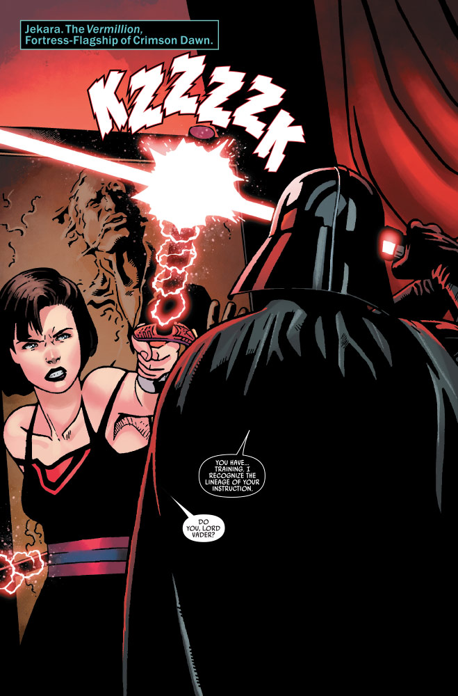 In Star Wars #16, Qi’ra, Han’s onetime love and leader of Crimson Dawn, locks blades with Darth Vader…