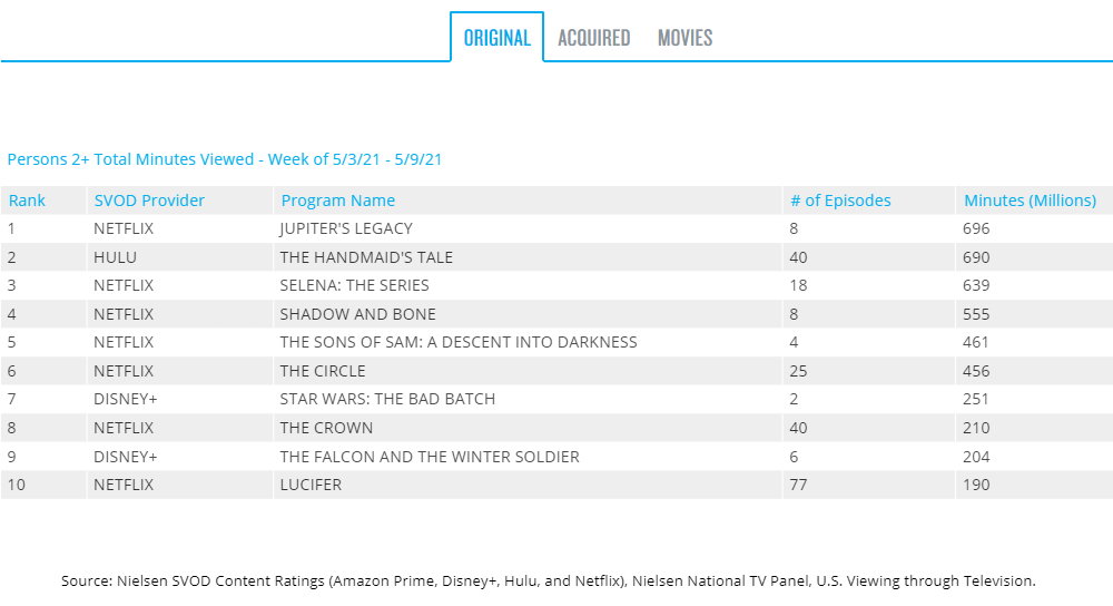 With the first two episodes landing on week of release on 4th and 7th May, The Bad Batch has leapt to the top of the line of Disney Plus steaming shows, entering the top ten Nielsen streaming shows in 7th position. With the already cancelled Jupiter’s Legacy leading the streaming chart, 7 of the 10 shows in the top 10 are Netflix productions, with The Bad Batch and The Falcon and The Winter Soldier at number 9 the two Disney entries and The Handmaid’s Tail from Hulu at number 2.