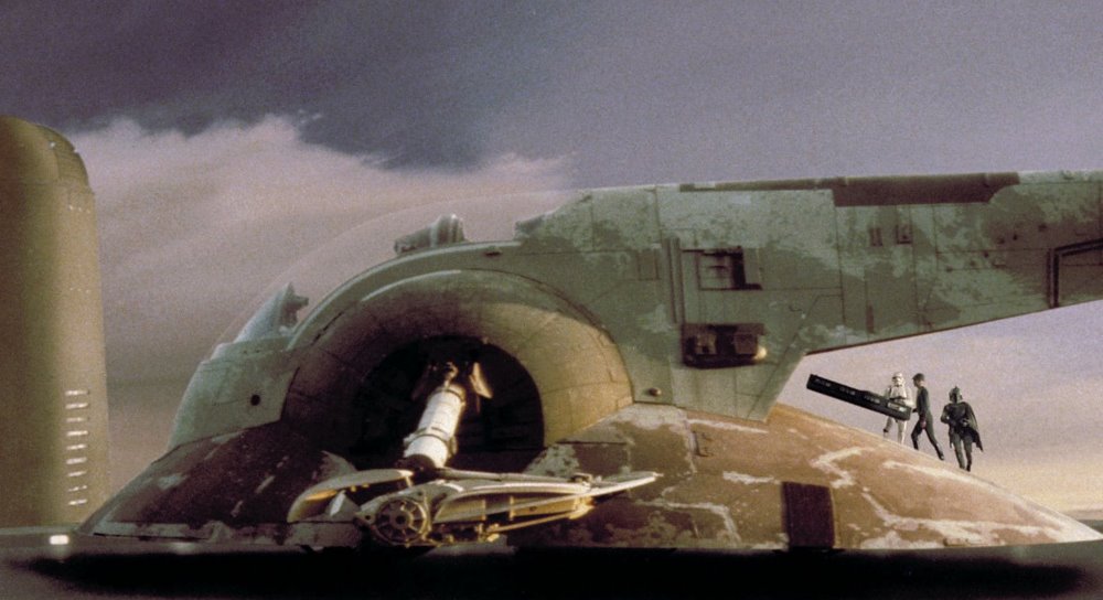 The hangar where they find Boba’s ship has been seen before in the game Battlefront II, only with the Khetanna in it. As he tries to fly away, he knocks over a Bantha-II cargo skiff.