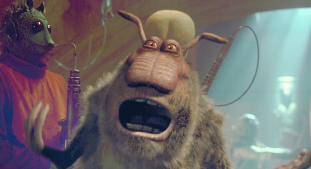 For the time we see the Palace’s kitchen. In it we see a COO cook droid (first introduced in Attack of the Clones) and an EV-series supervisor droid acting as sous-chef. This droid uses the same prop as the one that was seen in Chapter 5 and Chapter 10 of The Mandalorian, which was identified to be EV-9D9. While this is a flashback, it seems likelier that this time around it is a different droid and not EV-9D9.  The creature is technically an unknown but could very well be a one-eyed version of a gorg as there are many variations of them.