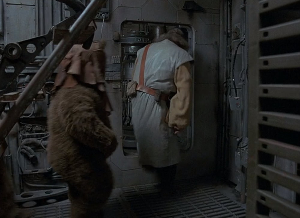 At the time the first Ewok Adventure was conceived, the creatures were only known for their appearance in Return of the Jedi, and Lucas and company wanted to keep the story standalone. As a result, the first film contains very few of the hallmarks we associate with Star Wars. The Ewoks themselves, and their forest moon home on Endor, are just as we remember them. Aside from that, there’s not much to make the film look like Star Wars. The character Mace Towani wears an orange flight suit and carries a blaster, and there’s one starcruiser, but that’s about it.