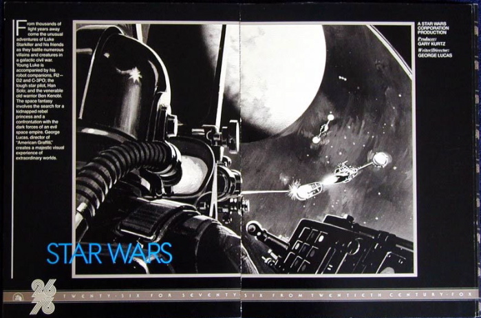 As stated on our episode, you have a slim to none chance of tracking one of these down, but I love it! The text is incredibly exciting as it describes the adventures of our heroes and their fight against an evil empire in a Fox campaign book highlighting upcoming movies. I love the image with what looks like early Y-Wings in the distance instead of the more typical X-Wing which appeared on posters and other products shortly after.