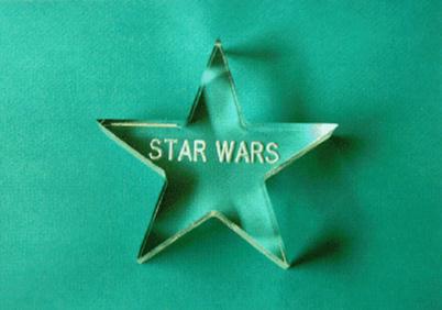 Other items which are cheap and fast to produce are badges (buttons!). This badge on the left features a different version of the Star Wars logo which went through many iterations as shown on many of these early products. This version has been dubbed “the pointy W” by collectors and features on posters also. There are many different styles of badges, some featuring characters, which are mostly text based.