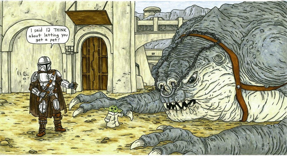 As for characters, they’re all here. Ahsoka, IG-11, the Armorer, Bo-Katan and many more are present, while we also delve into the two episodes of The Book of Boba Fett as we head to Ossus and watch Luke and Artoo as the quietly see Luke and Grogu reunite. We fly in the Razor Crest, see his modified N-1, meet Doctor Pershing, travel to the Mines of Mandalore and even get a scene with Porgs, Ewoks, Wookiees, Hutts and Loth-Cats. Suffice it to say, it’s packed with smart puns, cute images and a lot of heart.