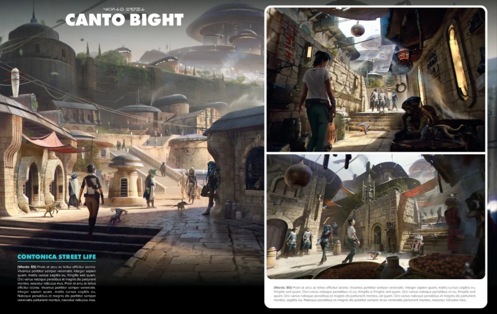 Taking its cues from The Last Jedi, the world here is still in a state of development, taking elements from Doctor Aphra which has seen our errant archaeologist travel to Canto Bight in this era. However, unlike the film we see the workers district, some of the less classy cantinas (like the Broken Hoof) and one of its oldest buildings, the Crescent Royals Casino and Club Tarsus, a music venue. The book continues in thie vein, taking us to Toshara, Tatooine, Akiva and Kijimi before digging into the technology of Outlaws where we look at speeders, the central ship the Trailblazer, pirate, syndicate and civilian ships, droids of all kinds and then a dip into some of the ‘props’ that make up a location; arcade machines, food stalls, food and more.