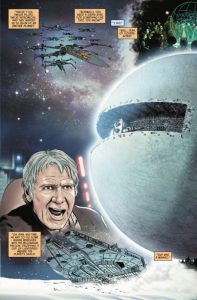 The first nine pages of Poe Dameron 28 are a surface retelling of the battle of Starkiller base from a slightly different perspective than our heroes on the ground in the Force Awakens. Unzueta picked up artistic duties in issue 14 and, while I personally find Noto’s style preferable, Unzueta has been doing a fantastic job. Keeping my opinions limited to issue 28, his epic depictions of space battles don’t skimp on details and give us Star Wars fans that tried and true sense of galactic scale. Unzueta’s space-borne Battle of Starkiller Base is played out across four double-page spreads which economic use of the space provided without robbing the reader of the details. Unzueta is stronger on technology than depictions of human faces, but nobody’s complaining with what Larocca is doing over on the main Star Wars series. Prianto’s aide on colors makes Unzueta’s art vividly pop with bright purples and blues set against the black vacuum of space.